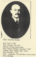 “SHELDEN, Henry Dusenbury, lawyer, capitalist; born, Portville, N.Y., June 17, 1862; son of Allan and Katharine (Dusenbury) Shelden; B.A., Yale College, 1886; studied law and was admitted to the Michigan bar, 1887. Entered wholesale dry goods business in Detroit, 1887, and continued until 1890; since 1890 has devoted attention mainly as member various corporate boards; director Detroit Copper and Brass Rolling Mills, Fort Street Union Depot and Station Co., Alger, Smith & Co. Republican. Presbyterian. Member Detroit Board of Commerce. Club: Detroit Racquet and Curling, Country, Old Club. Recreation: Horseback riding. Office: 14 Shelby Blk. Residence: 196 Fort St., W.