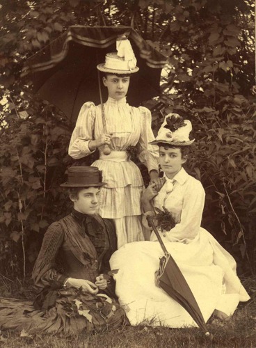 Possibly Sarah Josephine Anderson on left, Fannie Anderson standing and an unknown person on the right?