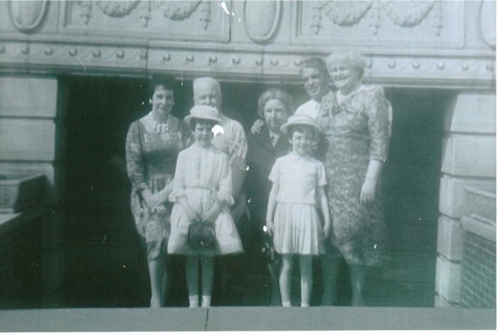 “Back Row: Priscilla Brennan Crawford, William O'Connor, Florence McHugh Crawford O'Connor, George F Crawford, Jr., Eileen "Sis" O'Connor. Front: Colleen Crawford, Susan Crawford - Ca 1960-1962 Brighton, Massachusetts”