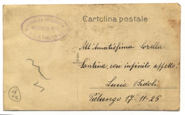 Original postcard in the possession of Emily Ferroli Duserick (August 2008). Daughter is Beatrice Menegon at age 5, who married Celso Vallar.