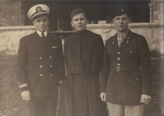 "November, 1944 - My great uncle Ambrose Nangeroni, Uncle Robert Varnerin,my dad Lawrence Varnerin"