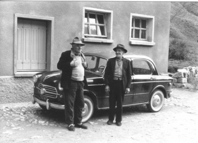 Inglagna anni 50.... i due padroni luviju e Iosco da destra Vallar Luigi ( Luvigiu) e mio nonno Sante Vallar . a Inglagna davanti casa mia ..fine anni 50 ..