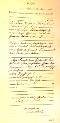 To the official signing this document came today personally known Mrs Josefine Baret, born Neumann, no profession, living in Meerbeck, Bismarckstraße 17 and reported, that her husband, the merchant Giovanni Battista Antonio Baret, 33 years and 5 month old, of catholic religion, living in Meerbeck, Bismarckstraße 17, born in Ombrena, parish of Tramonti di Sotto, County Udine in Italy, son of deceased Paolo Baret and his deceased wife Pazienza born Rugo, both at last living in Ombrena,