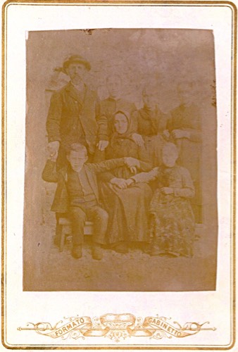 Anna Zannier Bidoli is front center, to the left of her is her son, Giovanni Battista Bidoli, behind him is her husband Giovanni Ferdinando Bidoli, to his right are daughters Santa and Maria Bidoli, an unidentified person (possibly Emilia Giuditta) and in front daughter, Lucia Bidoli. The photo was probably taken between 1891 and the death of Giovanni Ferdinando in December 1896. This is a scan of a copy of the photo in the possession of Emily Ferroli Duserick, October 2009.