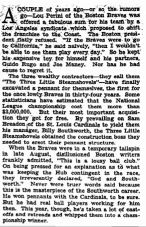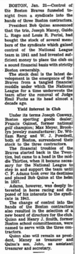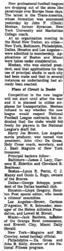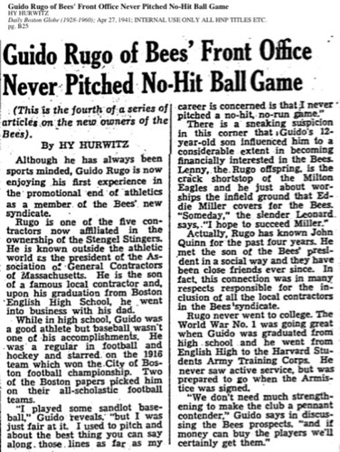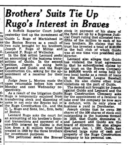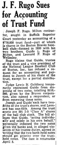 In 1944 the Braves owners had a plan for a new professional football league. In January, 1946 the Braves hired a Rugo family friend, Billy Sullivan, as public relations director. In 1959, Billy Sullivan accomplished this goal when he helped found the American Football League and the Boston Patriots.