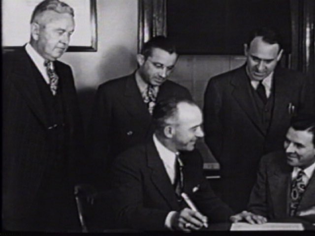 Boston Braves owners C. J. Maney, Guido Rugo and Louis Perini watch as Billy Southworth signs his contract to manage the Braves.