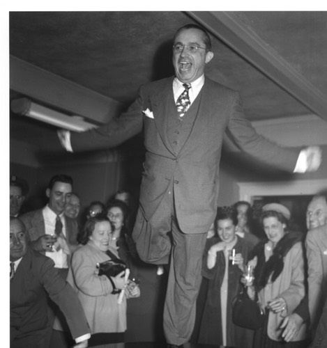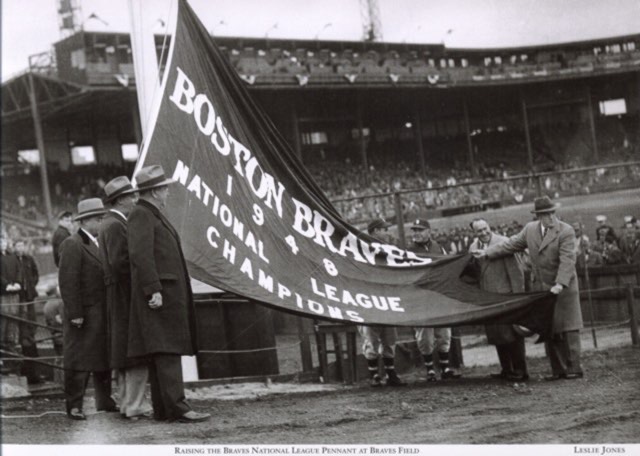 “Officials pose with 1948 National League pennant prior to Marines raising the banner at Braves Field on Opening Day 1949. (l to r, on left of pennant) Braves co-owner Guido Rugo, general manager John Quinn, owner Joe Maney, (on right of pennant) owner Lou Perini, and National League president Ford Frick. Player representative Tommy Holmes and manager Billy Southworth are visible on right behind pennant. Photographer: Jones, Leslie, 1886-1967 Date: April 18, 1949”