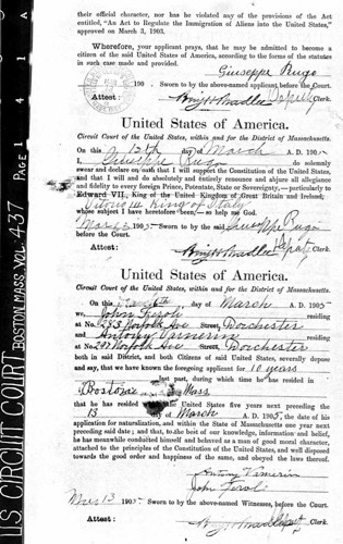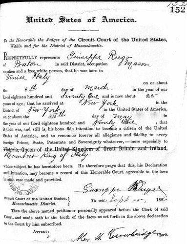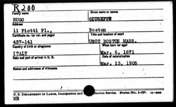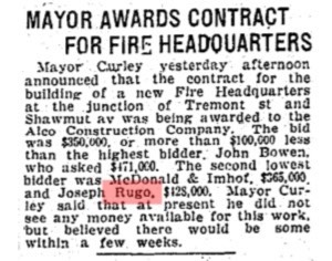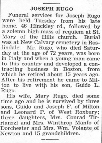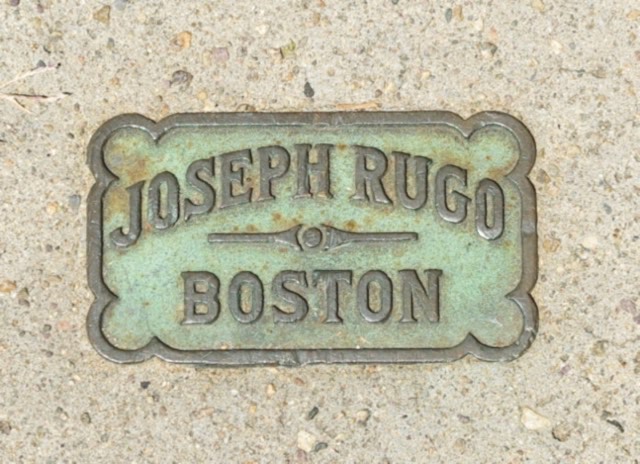 August 2012 - I found this marker in the driveway of 92 Melville Avenue, Dorchester. It was probably installed in 1922 as Joseph Rugo signed a building permit for the construction of a garage at the property that Spring. The adjacent home at 98 Melville Avenue was owned by the Piotti family and they also built a garage in 1922. I believe that there may have been a similar marker in that driveway. Twenty years earlier my great grandparents had been tenants of the Piotti family, living on Piotti Place, off Franklin Court, across from 321 Norfolk Avenue. Most of that area is gone, now part of the Boston Edison / NSTAR facility fronting on Mass. Ave. I suspect that the connection to the Piotti family at 98 Melville was how Joseph Rugo got the job for the garage and driveway at 92 Melville Avenue.