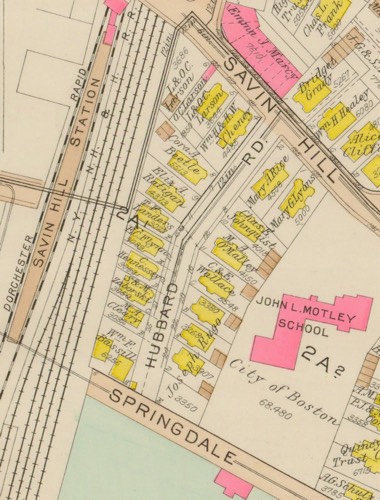 Originally Hubbard Road. Three three-deckers built and owned by Giuseppe Rugo (later owned by his daughters?). All of the buildings on the west side of the Hubbardston Road were demolished for construction of the Southeast Expressway, I-93, in the 1950s. Giuseppe was awarded the contract to build the Motley School in December 1922 and applied for permits to build his three-deckers in the Spring of 1923.
