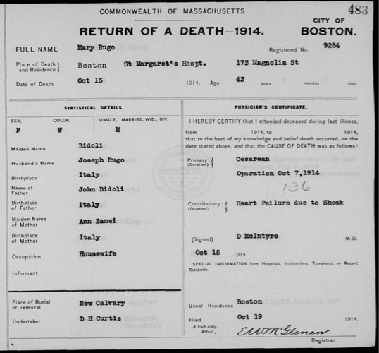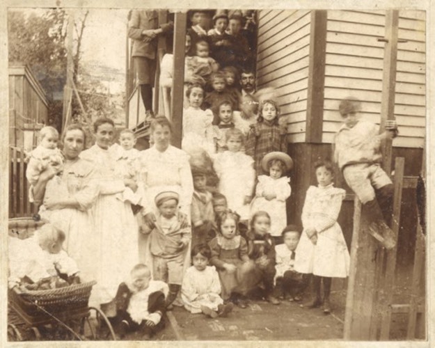 Photo taken at the rear of 321 Norfolk Avenue. Appears to be Maria Bidoli Rugo on the left, Best guess is that the photo was taken in 1901 and she is holding Joseph, born in March 1901, Emilia in the carriage, about 18 months old, and Guido at her feet, three years old. She was living at 321 Norfolk Avenue when Joseph was born. Photo scanned from Louise Varnerin DiTullio's original.