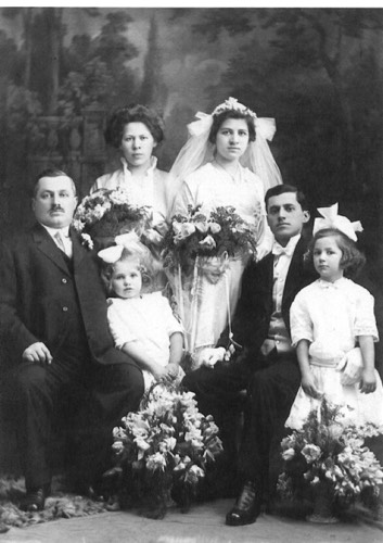 Wedding of Uncle Alvise Rugo to Annie Varnerin in 1914. Anna Rugo is the flower girl on the right, her father, Giuseppe, is on the left.
