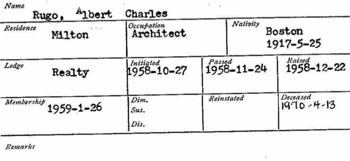 Massachusetts Mason Membership Card Albert Charles Rugo