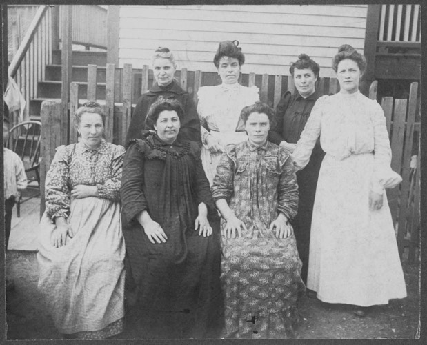 Santa Masutti Varnerin seated at left. Next to her is Margherita Miniutti (wife of Pasquale Miniutti). At the far right in the white dress is Luigia Bossi Colombo (wife of Eugenio Colombo). Standing next to her is her sister=in-law Rosa Colombo Bossi (wife of Romeo Bossi) - Romeo Bossi was the uncle of Luigia Bossi Colombo). Three other women are unidentified. Picture reportedly taken ca. 1902-1903 in front of 323 Norfolk Avenue, Dorchester.