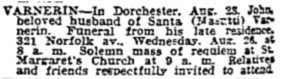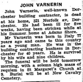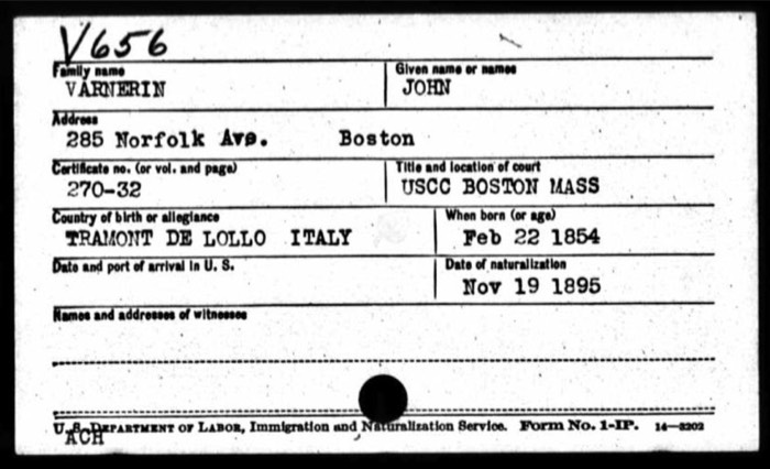 Lorenzo Varnerin (1855-1913, no apparent relationship to Giacomo/John Varnerin) in 1896 at age 41 came through Ellis Island with Giovanni Fachin age 37 and Pietro Fachin age 42. The two Fachin were among the contributors from Dorchester to the church building fund in Tramonti in 1898 but I can find no other information about them in the US.