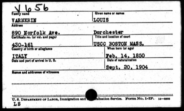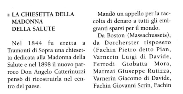 Lorenzo Varnerin (1855-1913, no apparent relationship to Luigi Varnerin) in 1896 at age 41 came through Ellis Island with Giovanni Fachin age 37 and Pietro Fachin age 42. The two Fachin were among the contributors from Dorchester to the church building fund in Tramonti in 1898 but I can find no other information about them in the US.