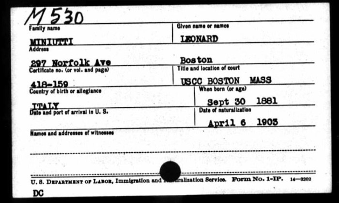 Photo taken by Falk Studio, 1139 Washington Street, Boston, Massachusetts. June 1899 marriage of Giuseppe Marmai (seated far right) to Maddalena Rugo. Standing at rear are Peter Varnerin on the left and Leonard Miniutti on the right. In front are John Varnerin, Lawrence, Santa, Joseph and Annie.