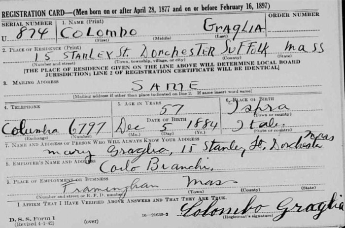 Colombo Graglia WW I draft